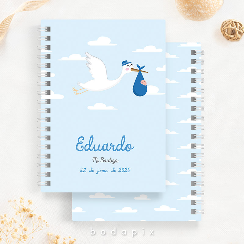 Libreta personalizada para bautizo Cigüeña azul