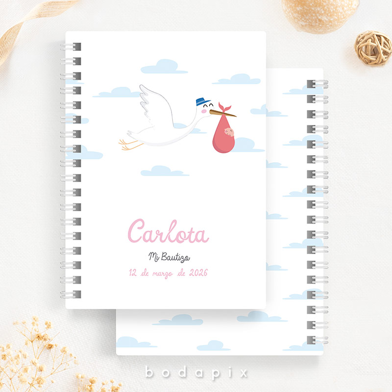 Libreta personalizada para bautizo Cigüeña rosa