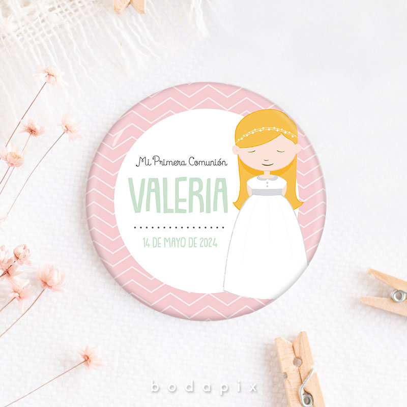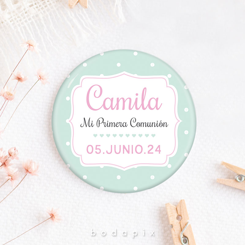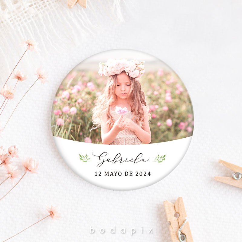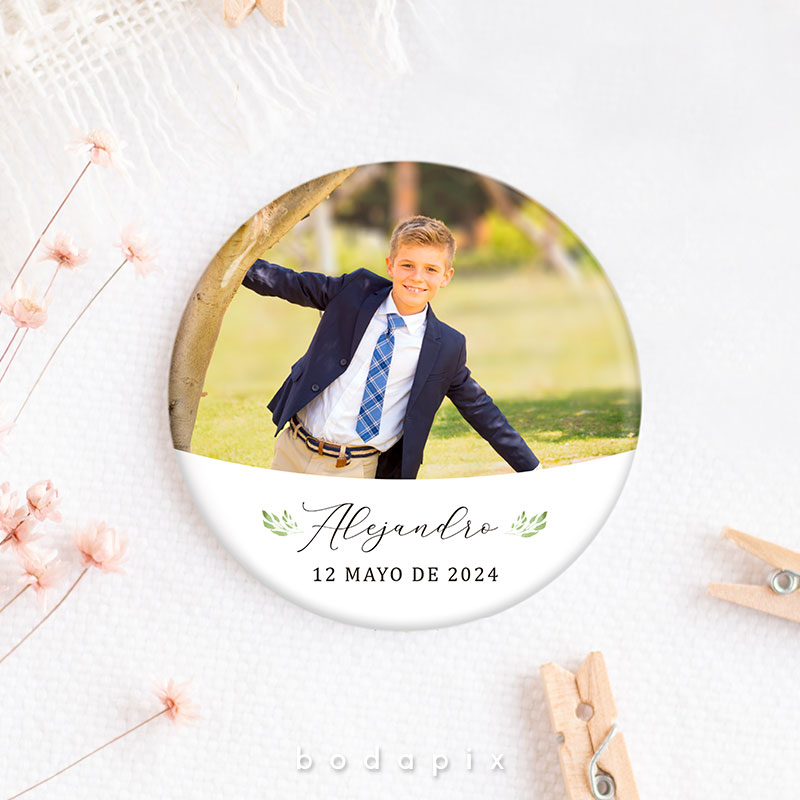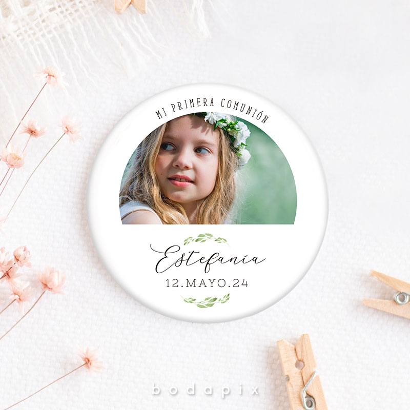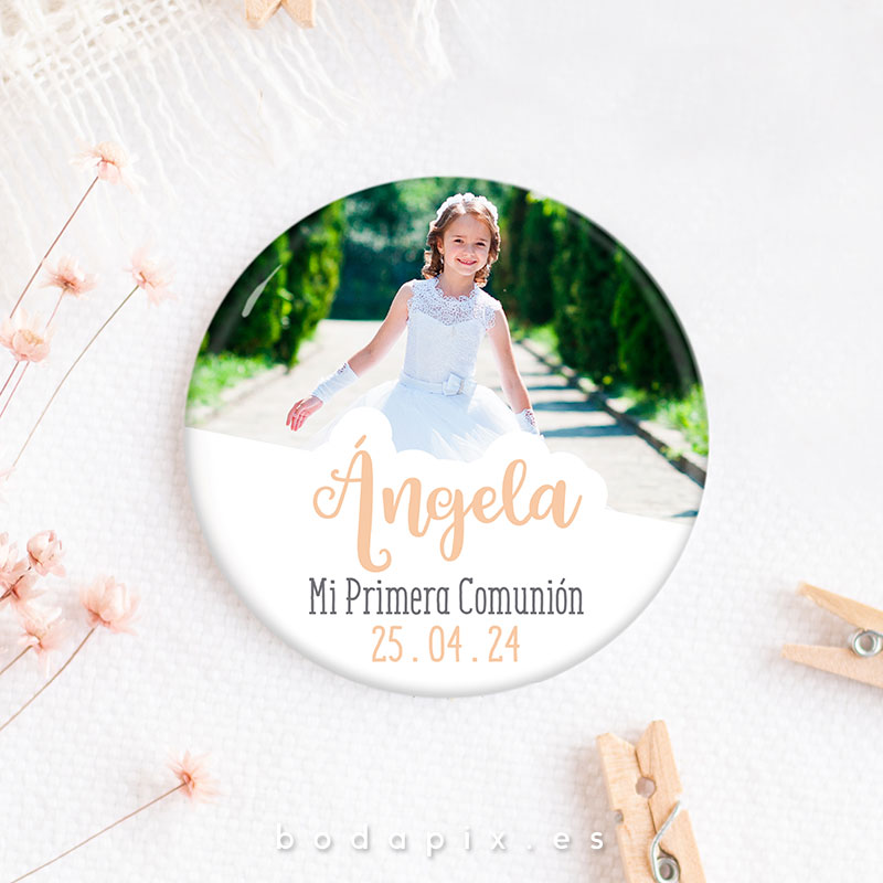 Un recuerdo encantador y personalizado que resalta en las celebraciones de primera comunión es la chapa personalizada. Estos pequeños objetos, típicamente hechos de metal o plástico, se diseñan meticulosamente con imágenes, textos y adornos que capturan la esencia de este evento significativo. Ya sea mostrando imágenes del festejado en su traje de comunión, incorporando citas inspiradoras o fechas destacadas, cada chapa se convierte en un símbolo único de la jornada.